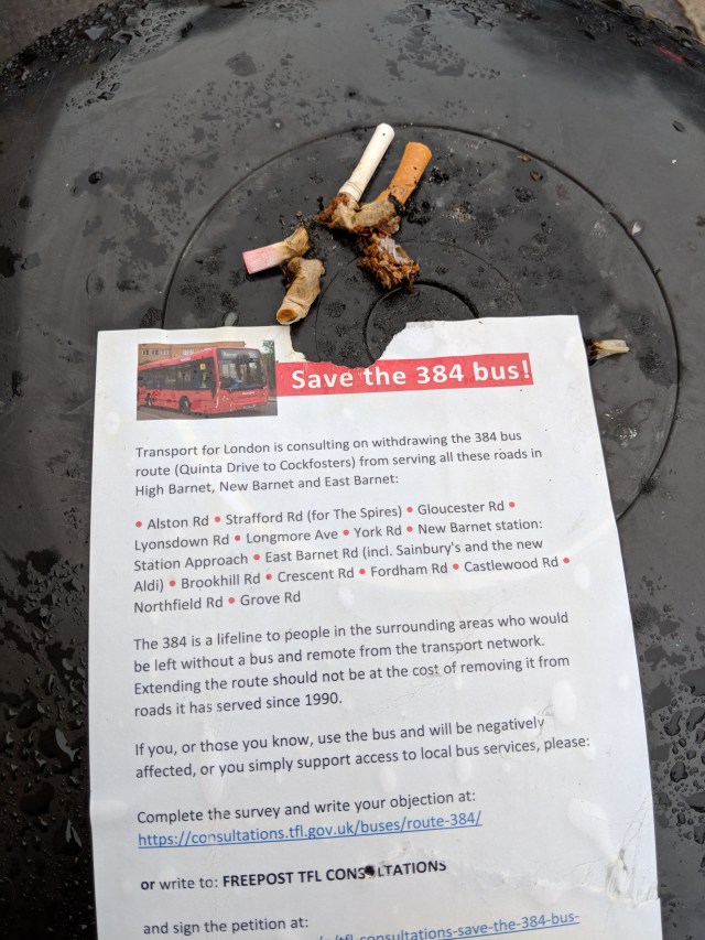 Here’s the leaflet about the endangered bus service. Note the interesting use of the word ‘affected’ in the last paragraph, indicating that the leaflet was almost certainly written by someone over the age of 60. The people of north west Scotland, for example, would find the idea that anywhere in London could be considered to be ‘remote’ from transport networks hilarious, although if you can hardly walk remoteness can be very close.
