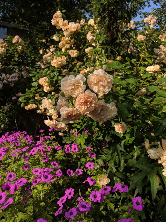 Here are two plants for old age. The rose is Buff Beauty. Unpruned or lightly pruned it will grow eight feet high with a spread of at least ten feet. It was growing here when we moved in 33 years ago and is still healthy. Here you just see a part of the shrub. The geranium is G. psilostemon, vigorous, self seeding.
