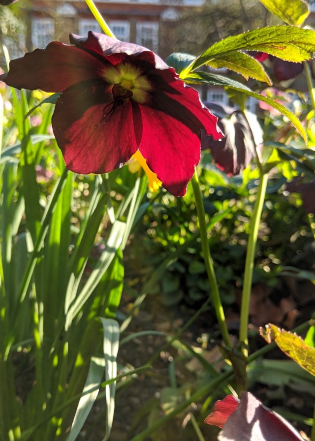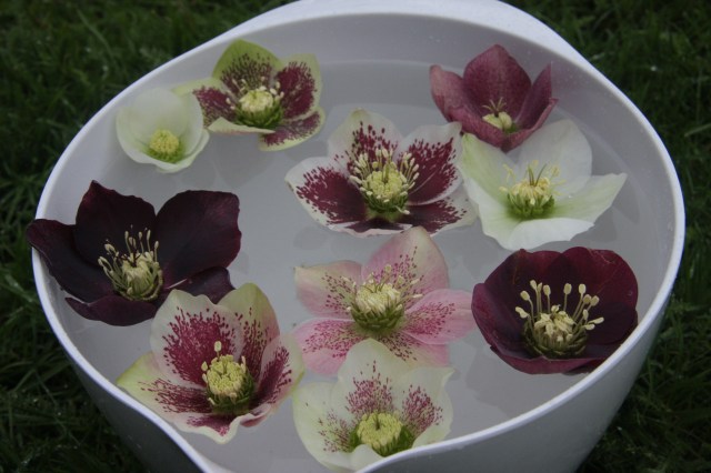 When the flowers open they hang down, and as they are fertilised they gradually lift up their heads. I had to get down low to take these photos, except for this last one. Hellebores don’t make a good cut flower but you can float their heads in a bowl of water. This little collection was made at St John’s, Waterloo some years ago. You buy one or two plants, dig up one or two more seedlings in a friend’s garden or your own,  someone gives you a few seeds, they all breed and multiply and without really trying you have a beautiful family. (I like the idea of plants from Bulgaria, Croatia, Greece, Turkey, Albania, etc. getting together to make a happy family.) Professional breeders are at work, producing expensive named varieties – like the double one in one of these photos – but you can create your own varieties, or rather look on as they create themselves, and you don’t need to give them names.
