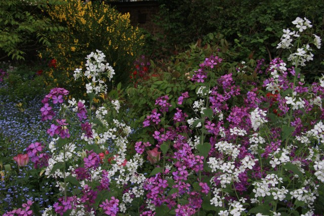 This is not contrived: in my last Notes I forgot the forget-me-not. Here it was two days ago. It keeps pace with honesty, contrasts and complements. It germinates in the summer and like honesty and the others it waits the winter out before racing away in spring.