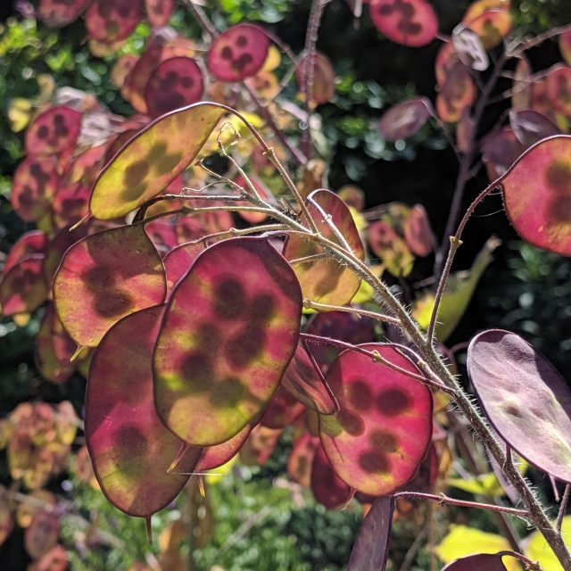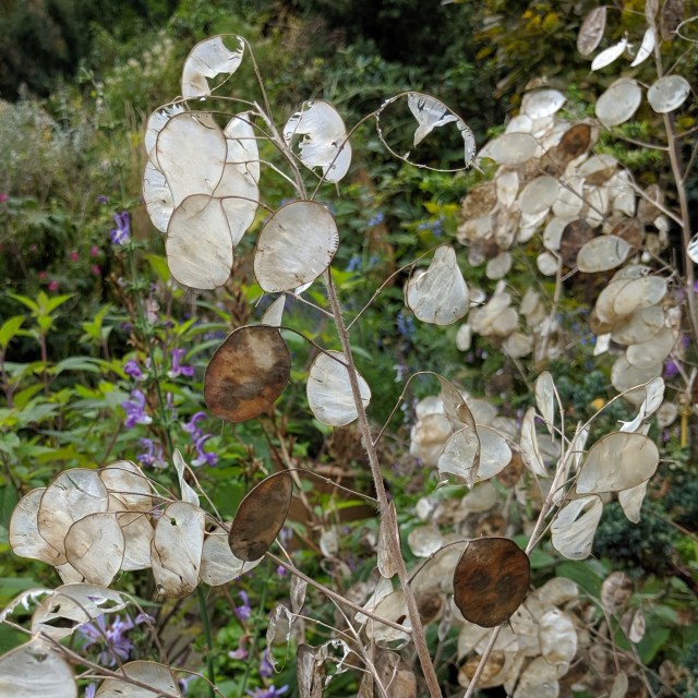 The seed pod has a central membrane enclosed within two outer skins. Sometimes the outer skin falls off early , but it generally lasts a long time, turning rather brown and mouldy but protecting the seeds within which don’t usually fall out until late winter, ready to germinate in the spring. In this picture you can see a few untouched pods, the brown ones. The white ones have been stripped down to the shiny membrane. You can just crinkle them a little and rub them between finger and thumb to make the outer skins fall away, and the seeds with them, then you have a christmas decoration. Or just a decoration.