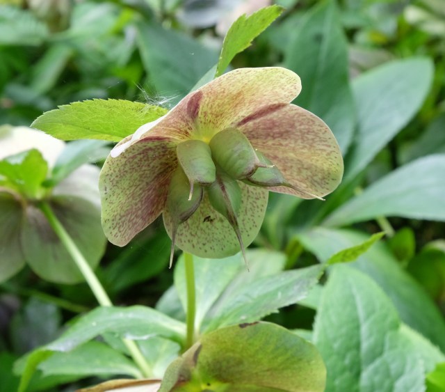 The hellebores have also seemed to retreat, to become invisible with so much else going on. The old flowers and flower stalks on some of them do look quite tatty now, but some show the promise of ripe seeds and on their petals a stiffened, shadowy memory of February’s colour: