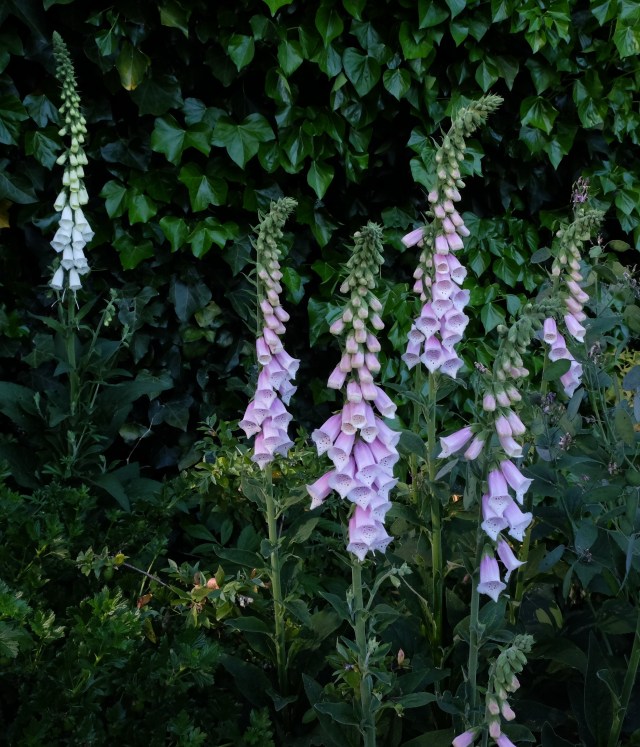 And to pick a plant which marks the beginning of summer I’ll say the foxglove. It’s well known that foxglove seeds stay alive for years and spring to life in the woods when a tree falls and light falls on bare earth. Unlike many bold, adventurous plants and cunning weeds, in the garden it usually won’t seed in little gaps or under the cover of overhanging leaves, it wants space. When we cleared big old laurels and rhododendrons at G. years ago a small army of them appeared. These ones are growing at the back of a neglected vegetable patch.