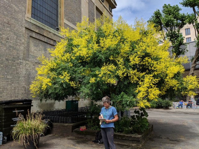 This koelreuteria – sorry, I know, one of the more tricky botanical names, after “Joseph Gottlieb Koelreuter, 1733-1806, professor of natural history at Karlsruhe, a pioneer experimental investigator of plant hybrididization”, aka Pride of India, although it comes from China, and Golden Rain tree – was a seedling from the garden of a customer of mine in Islington. I had it in a little pot at home for a few years, then in a bigger pot, where it endured without prospering. When we made a raised bed on the tarmac by the east wall of St John’s church we planted it out, and I thought it would only be happy there briefly because the bed was less than eighteen inches deep. But it developed into this wonderful small tree, no doubt by forcing its roots down through the tarmac to nose around among the sewers. It must be now getting on for twenty five years old, but it has only been at St John’s for ten years. It seems to like dry soil and a hot summer to flower well, and has chocolate brown inflated seed pods in autumn. This photo was taken in early July, so well after most trees and shrubs have flowered. We now have seedlings at St John’s, which will be available one day.