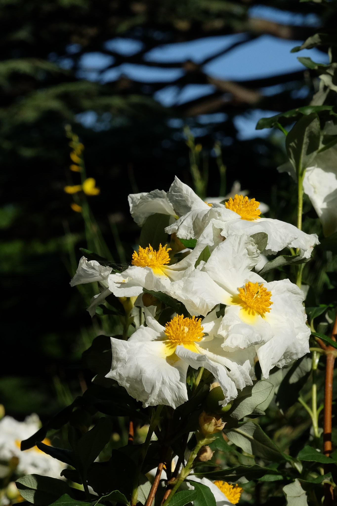 This is Cistus salvifolius, which you might have already seen, home and away, in no. 17. It looks as if it’s a parent of Cistus x corbariensis (when you see a cross in the middle of a name it means it’s a hybrid) which grows bigger and more upright. S. salvifolius grows low but vigorously. Here it’s growing in the part shade of a big cedar tree, in very dry soil. And the next one is C. ladanifer, I think, an extravagant beauty. It normally has a purple blotch at the base of the petal. like C. x cyprius, but this is the pure white form.