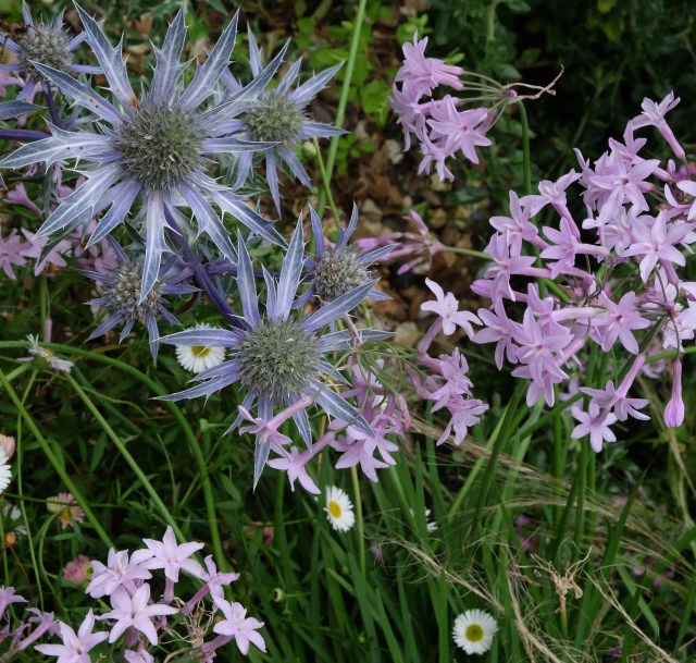 But this stipa sometimes needs, not a barber but a coiffeuse, to brush gently, not cut. Although, as with the dog, little fluffy tangles may need to be cut out, since they quickly weave and dreadlock together. Number 23 showed a picture of the eryngium with an erigeron and this year it has given rise to other nice combinations, here it is with a tulbaghia: