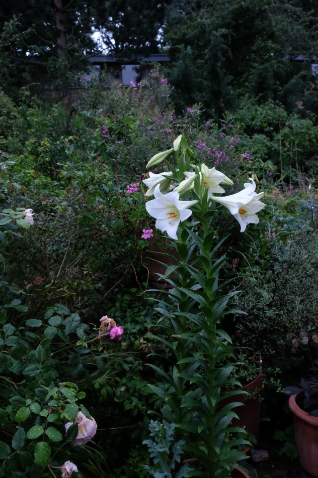 Spring is intoxicating but summer brings headaches. The leaves on one of my lovely Salvia patens look like a cross section through a diseased lung. After the hot spring, exile from the greenhouse for the morning glories was like going from the mediterranean to Scotland. And the new lilies I planted up in the autumn, White Heaven it’s called, which have grown splendidly both here and at St John’s, came to look too crisply perfect, too big and bold, and they began to remind me of the Kardashian building, which is maybe the most outrageous of London’s new buildings since the so-called walkie talkie which is better named the Fuck-Off building. (By the way, that’s its message to the world, I’m translating, not swearing.)