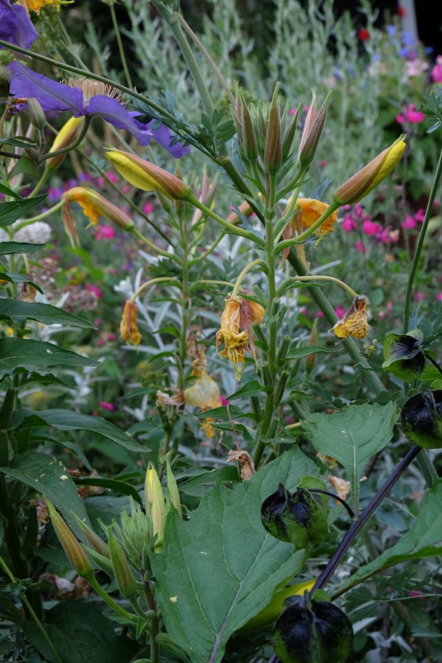 The next picture shows the various stages in the life of an evening primrose: at the top the flower buds which open, several at a time, each evening for weeks; then the furled buds which will be open in an hour or so; then yesterday’s flowers with their withered petals; and going down the stem there are progressively older seed pods.