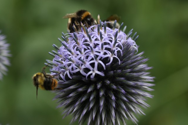 And here, since sometimes you find a whole throng of them, more excitedly crowded than on any other plant I know, except maybe Eryngium giganteum, are bees on echinops from – after a lot of searching, it turned out to be longer ago than I thought – 2013. Notice the proboscis of the bee on the left of the second photo: