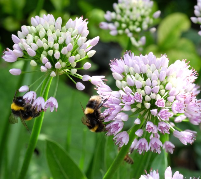 Allium angulosum, new to me two or three years ago. It’s called angulosum I suppose because in spring the new shoots at first grow out almost flat against the soil, at an angle instead of straight up, looking a bit like shallots. It flowers now, late July, early August, an unusual time for an allium; they are mostly spring flowering. The large flowers are a delicate pink and less than a foot tall. It comes as a weedy looking live shoot, if you order it in the autumn; nurse it through the winter and with a little patience it will spread into a thick clump. Today there were three kinds of bee on it. I grow it in stony soil, it has done well in all three gardens.