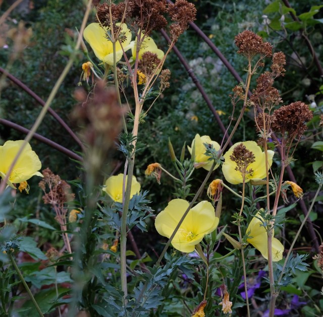 In spite of the obvious contrast in their habits, morning glory and evening primrose make a good pair. Now, in the middle of the day their petals have all withered. The evening primrose will open its next lot of flowers as dusk comes on, and they will still be fresh tomorrow morning when the morning glory opens again.