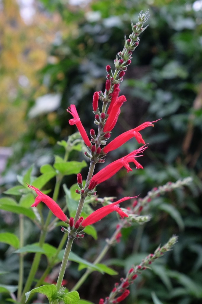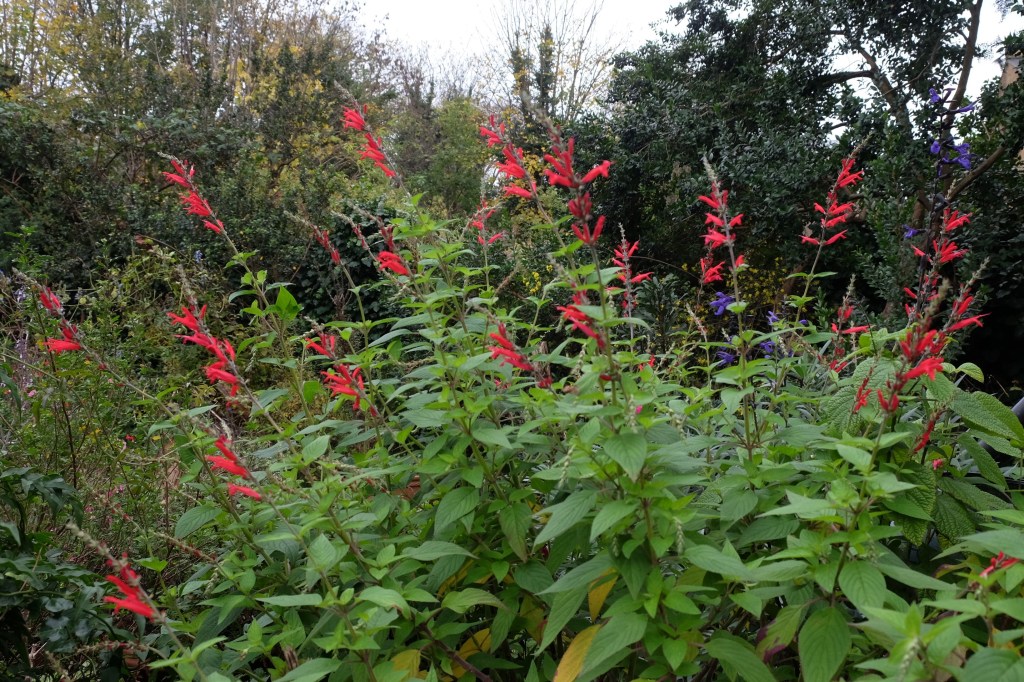 The salvias are still busy flowering, like the grasshopper in the moral fable who just goes on having fun (unlike the careful ant) until one day the bitter weather cuts its frivolities short. Most of them have been in flower for ages but this one, Salvia rutilans, which has been quietly growing all summer, doesn’t put out its flowering spikes until october, in some years and in some places too late to put on much of a show. This year however, it’s doing well. No frost yet in N 16.