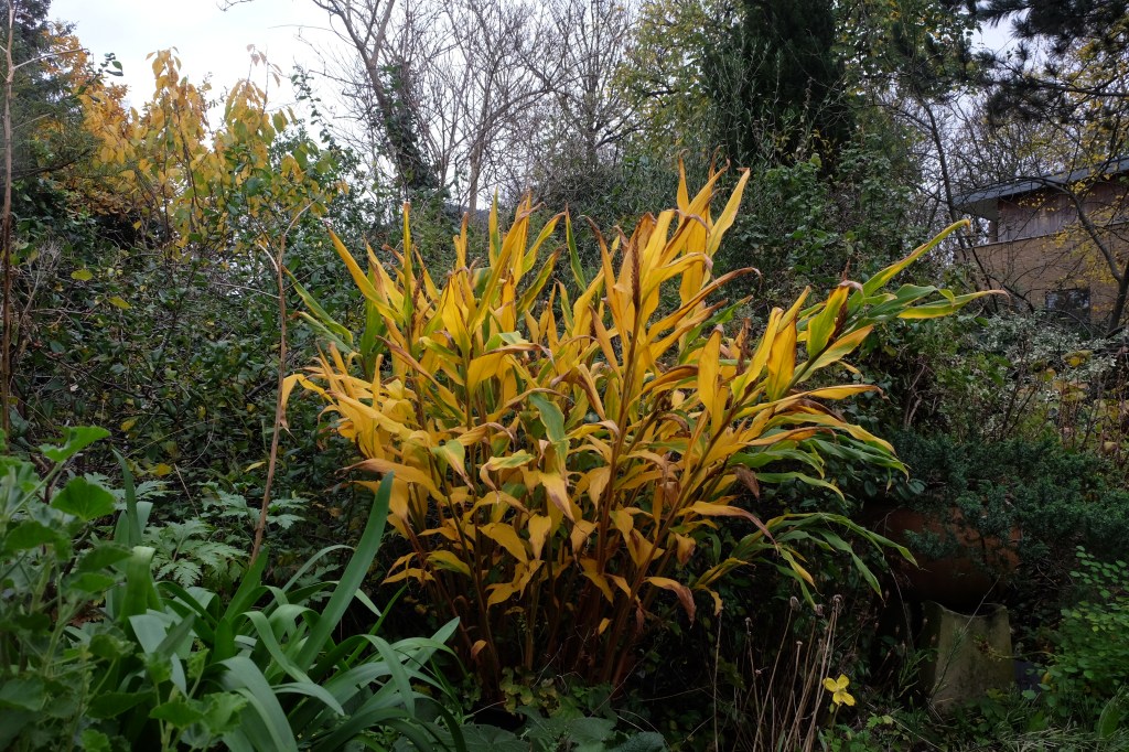 This is one of the easiest gingers to grow. It’s fairly hardy, especially if given a winter mulch. It likes it wet and warm. (Like the inula, it comes from the edges of the Himalayas, where winters are dry and summer brings the monsoon.)Mine is in a big pot. I had some of it in the ground, but like a lot of other things it didn’t like my soil, and because it comes into growth quite late it’s easily suffocated by the thrusting hardy plants of spring. I have one or two pieces potted up which I hacked off this spring, if you’re interested…..