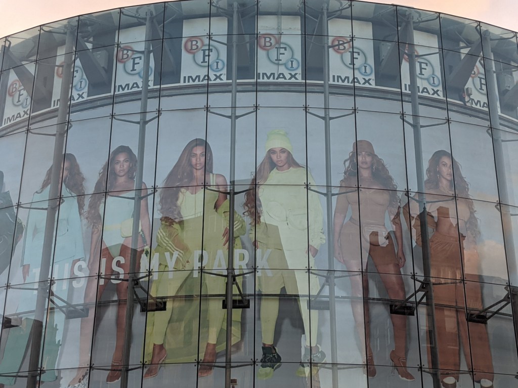 They’re a bit like a row of prophets or saints high up in a cathedral. And they all appear to be of the same person. The words spell out the message THIS IS MY PARK. ? The ever changing series of adverts changes the BFI Imax cinema into a huge hoarding – it ceases to exist as a building. It’s the heart of Waterloo, in the middle of a roundabout, reached by pedestrian underpasses. But just a few yards down the Waterloo Road is St John’s church – on the other side from the station and the buses – and its very nice gardens. See also Icons in SE1