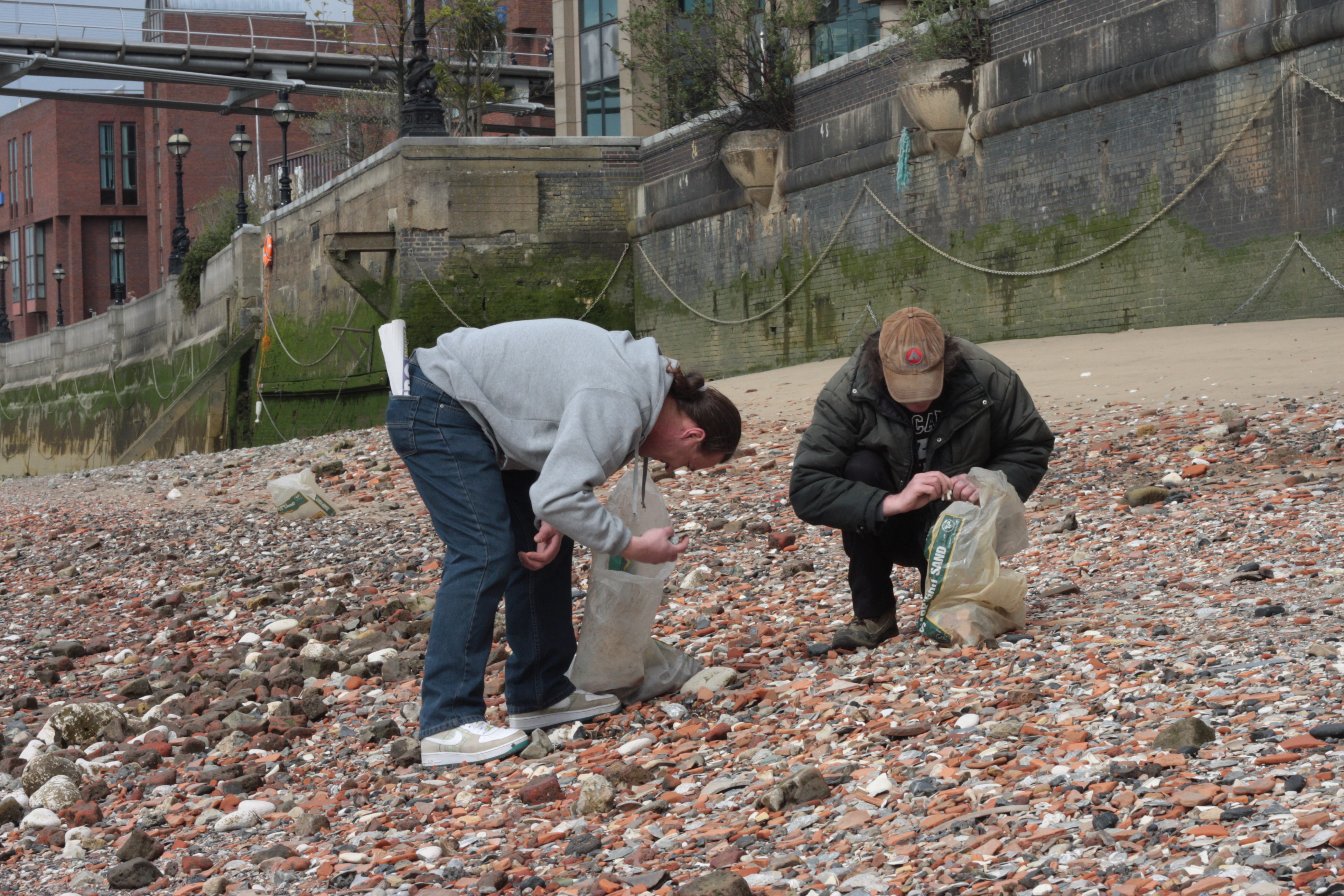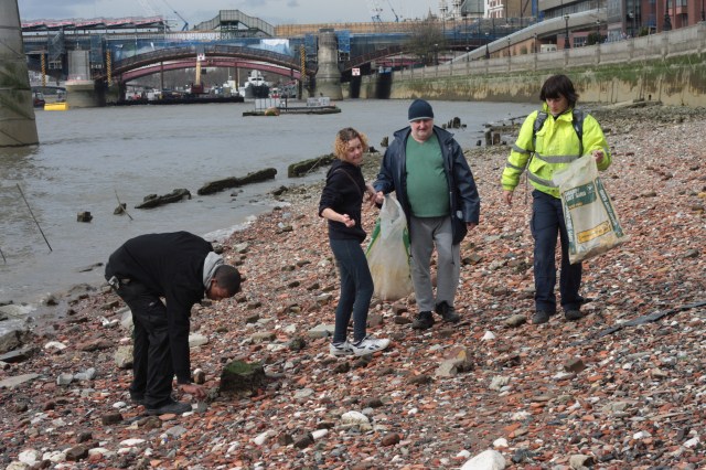 I remembered a trip to the shore of the Thames with a few of the Putting Down Roots volunteers. We went to get stuff for our new rock garden in St George’s churchyard in the Borough, near London Bridge. See also on Mint Street. We weren’t looking for anything fancy, just stone and bone, glass and shell, brick and tile.