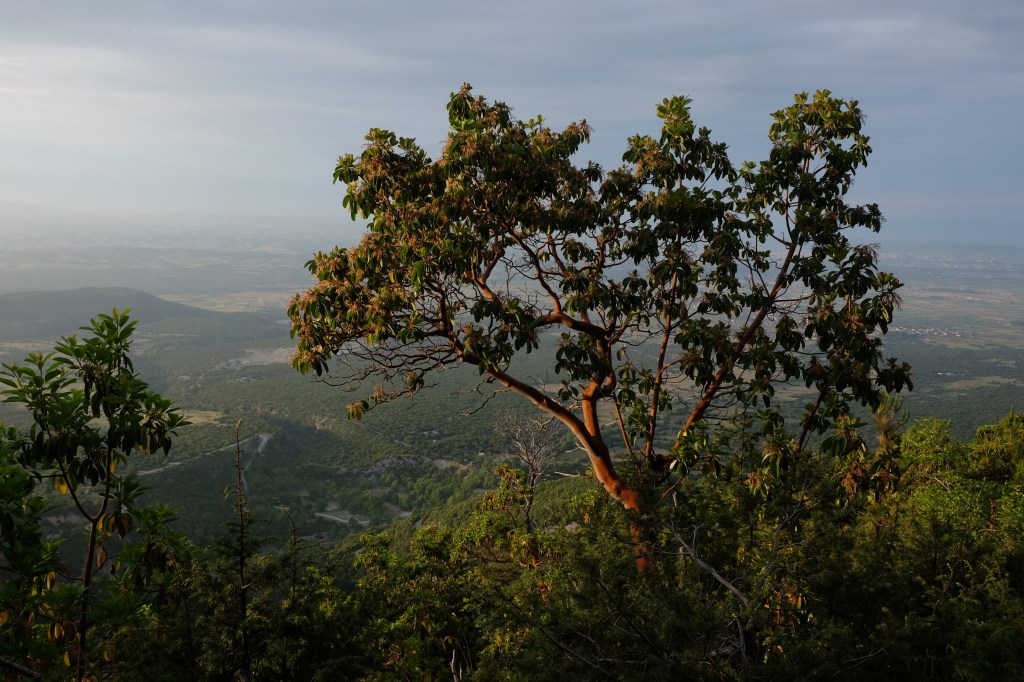 It was almost dark by the time I got back. Evening sun lighting up an arbutus, the road is still a long way below:
