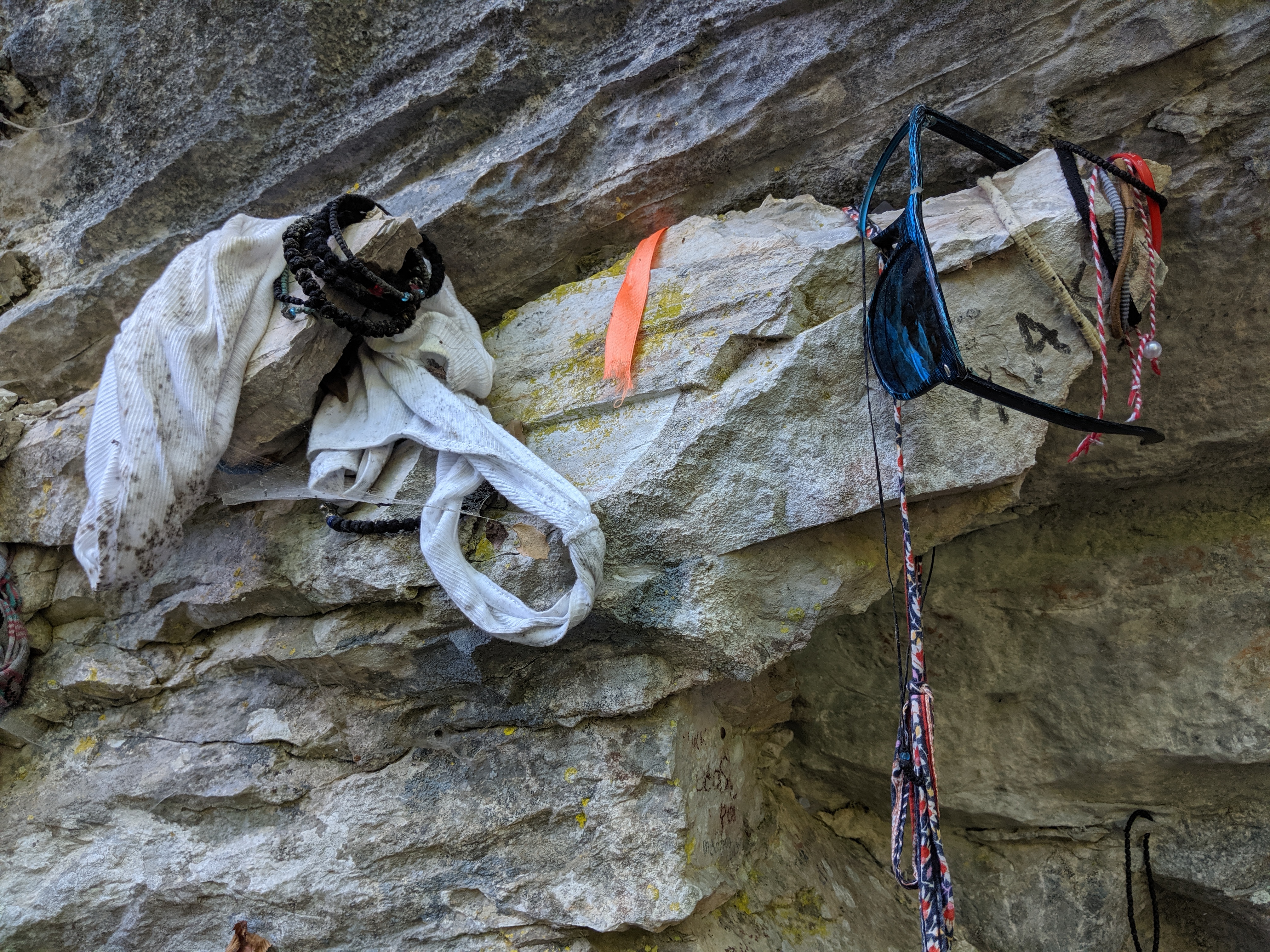 To effect a cure pilgrims leave personal articles pinned to the rocks, it’s like the holy well I visited near Lough Neagh.