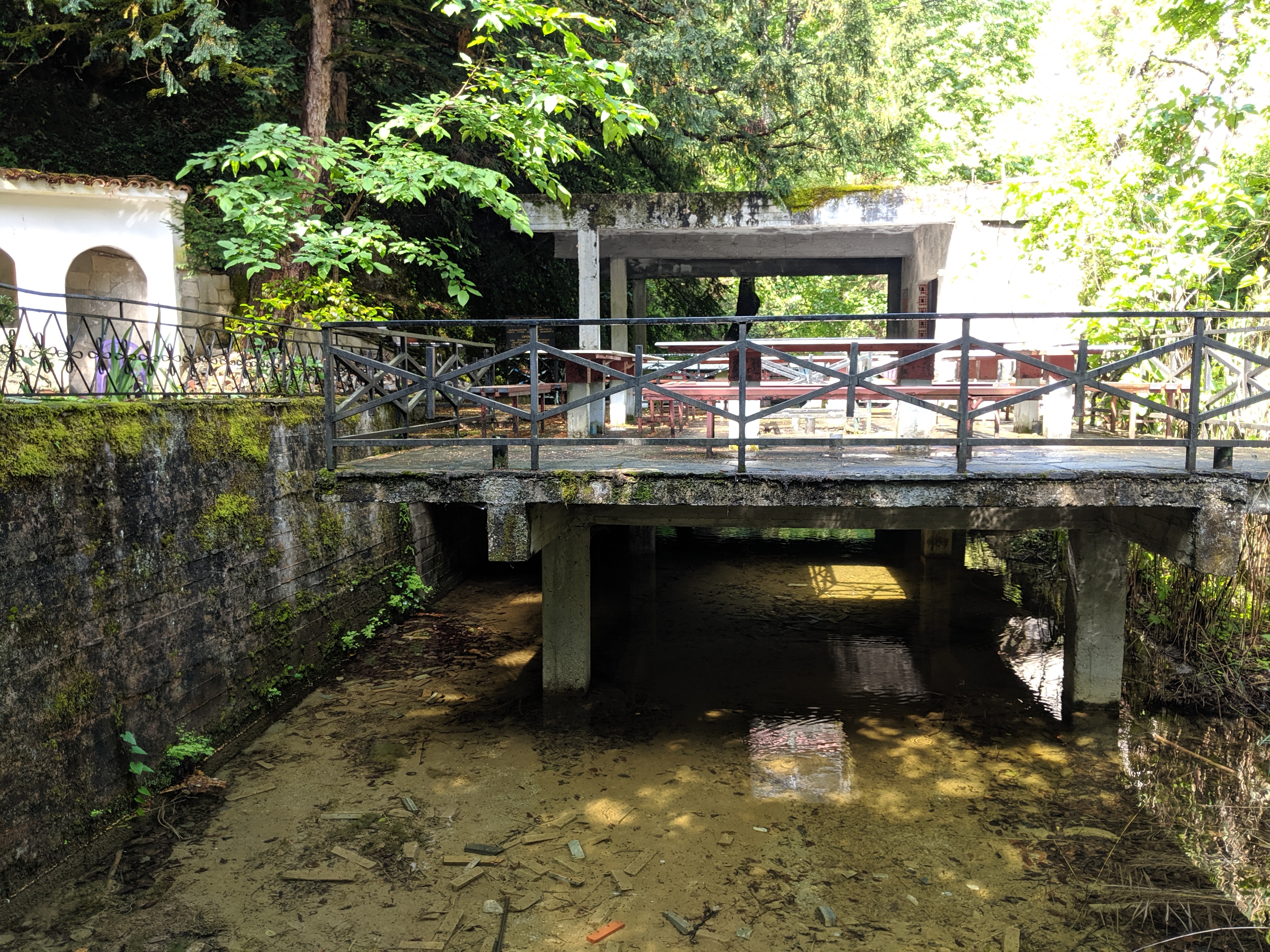 Before I set off along the valley I visited the nearby sanctuary of Agia Kori, literally saint daughter. She was a beautiful virgin who, being warned that the Turkish Pasha was about to enslave her in his harem, fled and hid in a cave in a lonely ravine, where she lived on roots and cranberries. Again, the american infection! There are no cranberries in Greece, and they certainly wouldn’t grow on limestone, as any gardener knows. Visited while dying by the abbot of a nearby monastery she received from him holy communion and at that moment a rock split open and holy water gushed out. This water cures all kinds of diseases, to this day. So many people visited that a cafe had to be built, and since there was no other building site in the ravine they put it in the stream bed, on concrete stilts.