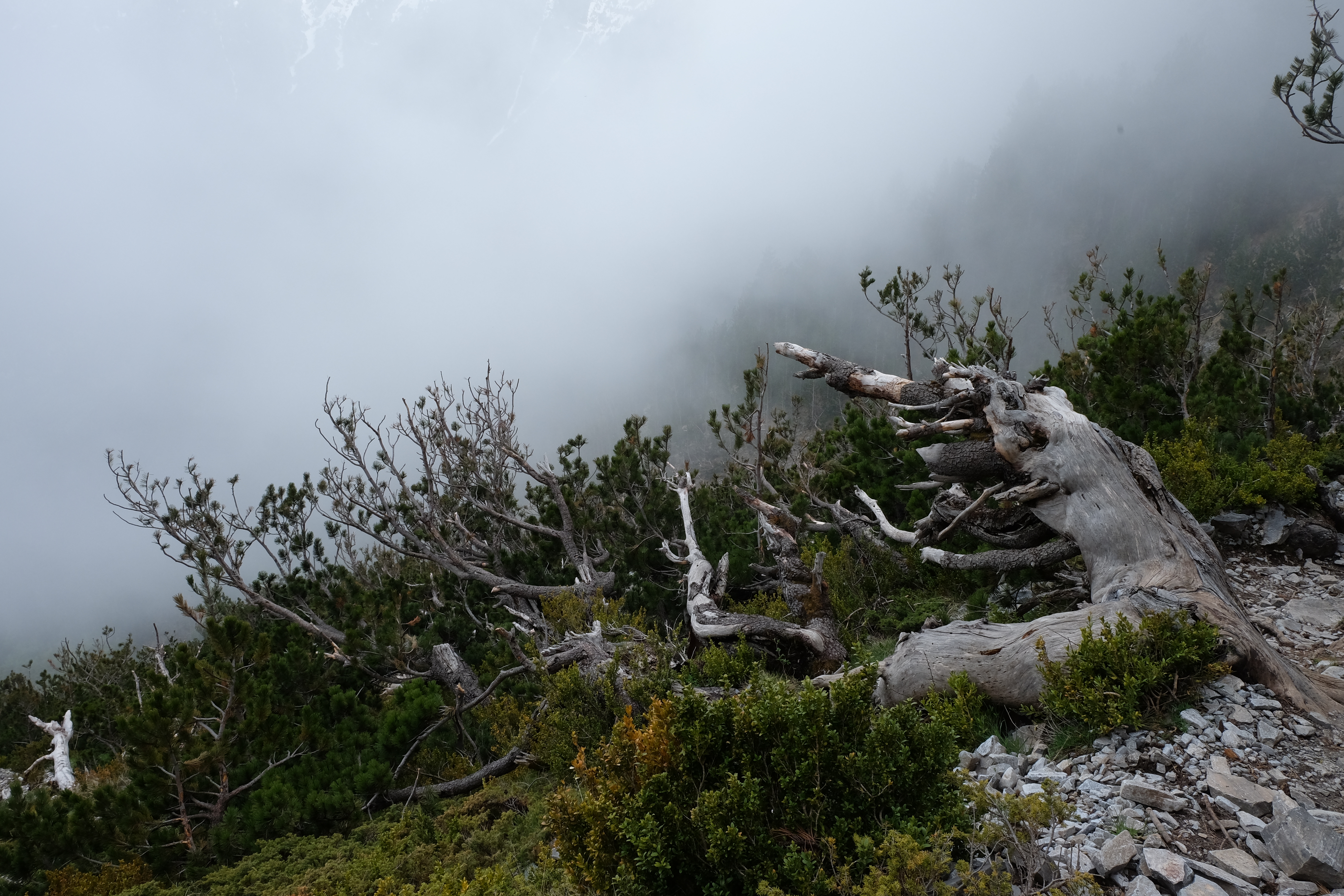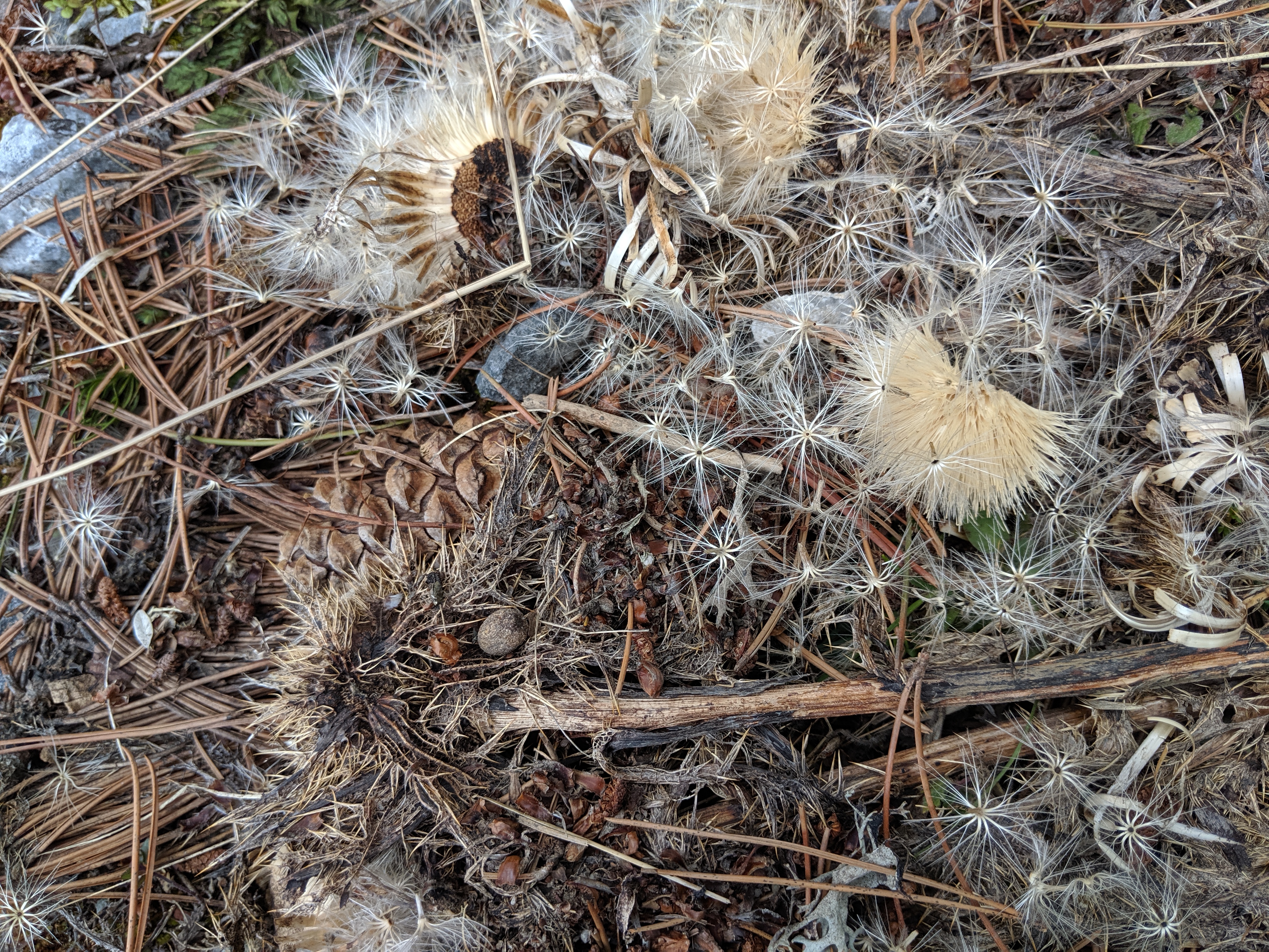 There were flowers I’d never seen before, dense vigorous forest, distant snowy peaks and still, at the end of May and at less than 2000 metres a wide snow field to cross, and avalanche shattered ancient pines, but this image might be the most vivid memory of that day. I need help to interpret it! It is itself like a memory from the previous year, perfectly preserved beneath ice and snow which have just melted. The plant forms are revealed like fossils which appear when stone is split open. But could even those delicate thistle seeds be saved intact beneath snow? Well, the truth probably is that the heads were preserved entire and that after snow melt a stirring breeze has allowed some seeds to break free. So I have to reluctantly give up part, the most beautiful part, of what I imagined. Across the mountain side this little patch, as far as I saw, was unique.