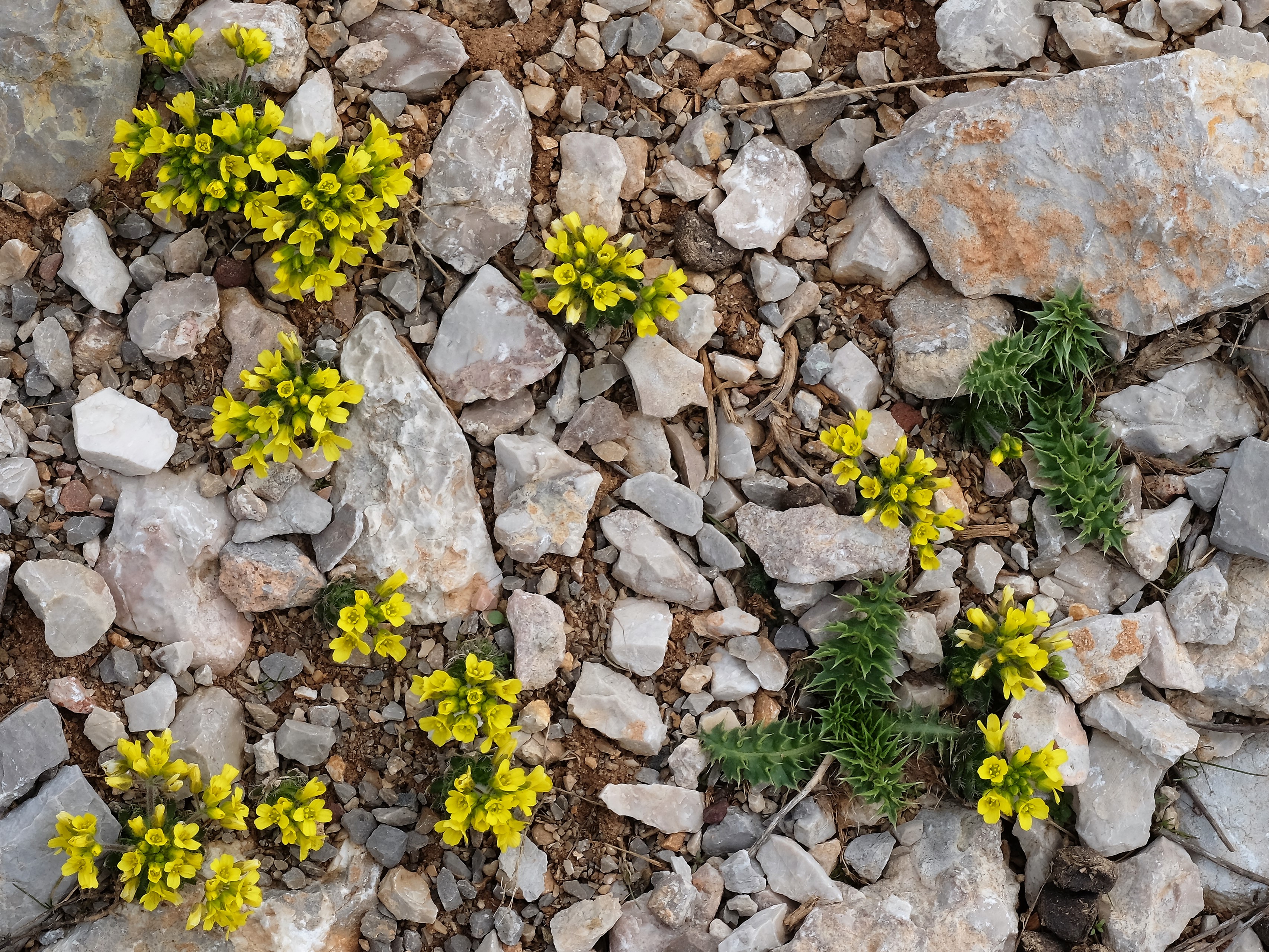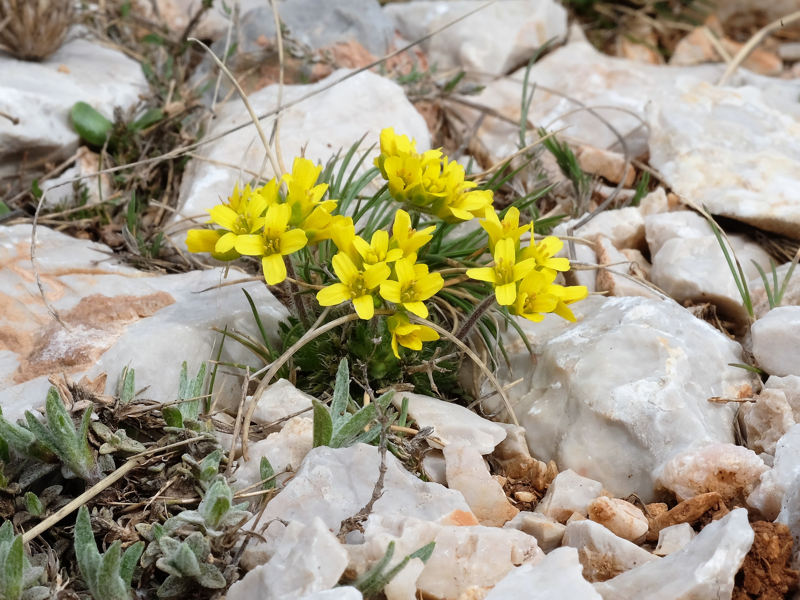 …. and a post script to the last piece, which could go on and on but here’s just one interesting picture. By early May the snow on the ski runs on Parnassos has melted and the stony base of one of them was bright with tufts of Draba parnassica. This seemed to be their special place; elsewhere they were much less common.