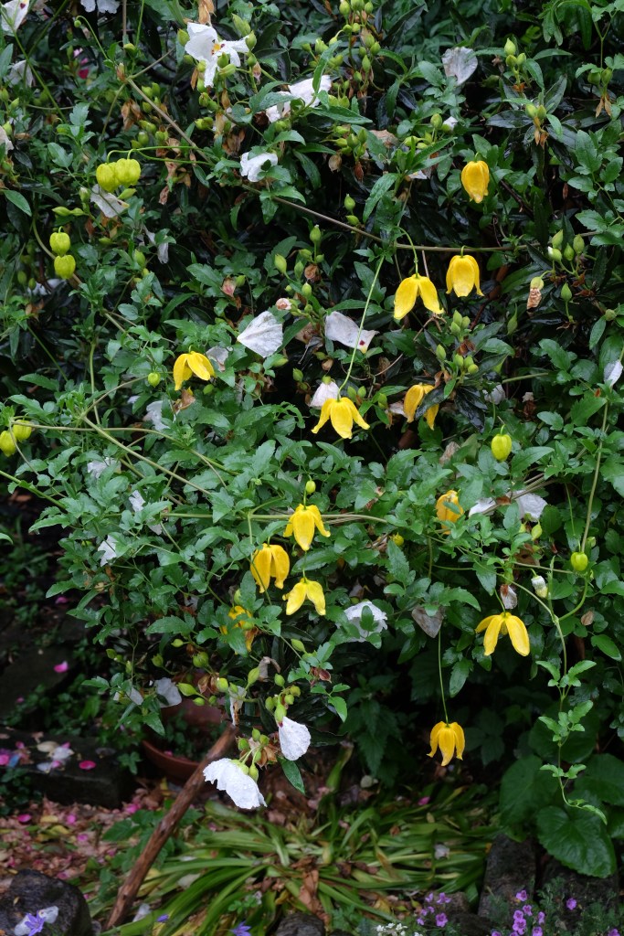 Clematis tangutica doesn’t much mind the rain, but the cistus has hardly put out any flowers this morning. There’s a delicate balance to be struck between the two plants. For a year or two the clematis was anxiously cosseted, now it’s spreading far and wide. without careful pruning it would smother the cistus, but I like their supervised meeting.