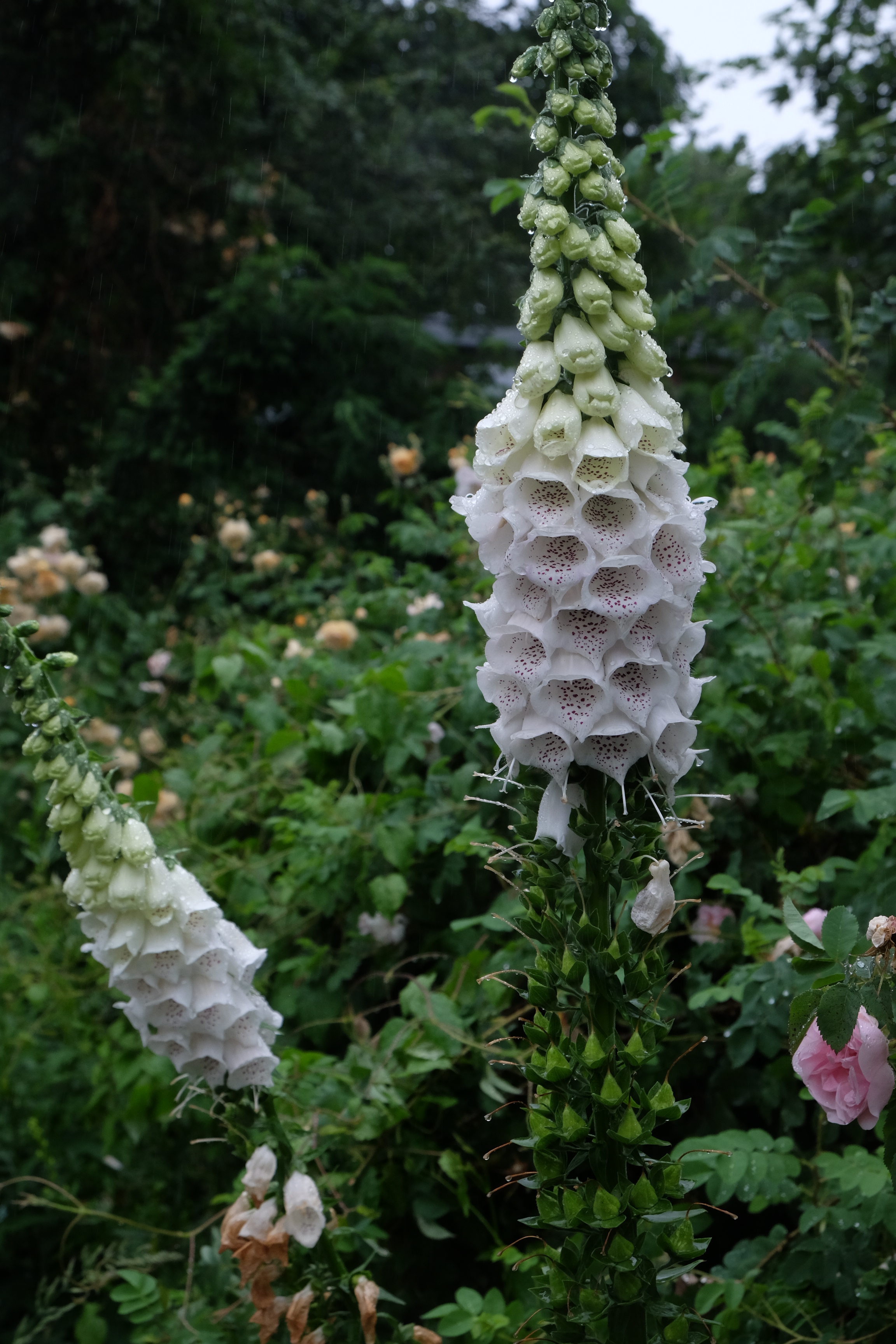 I’ve found it difficult to grow foxgloves. My garden is too crowded to allow them to germinate, they like bare soil for that, even though they produce huge numbers of seeds. The best ones grow wide-spreading rosettes of big leaves in their first year and then shoot up in spring. I was lucky to be able to take dig up a big lush clump of a plant in early autumn and get it established before the winter. They move easily at most times of year; they have a compact, fibrous root system. Unusually among big drought tolerant plants they don’t have a tap root which makes things difficult to move; plants don’t like having their tap roots broken. If you roughly dig up a dandelion and transplant it the chances are it will die, but the broken tap root you left behind will grow a new shoot, even from several inches down, and thrive. Foxgloves are famous for suddenly appearing when a big old tree falls and lets sudden light into the forest. They were spectacular after the great storm of 1987. At G., when we cleared a huge sprawl of laurels, fifty or sixty grew the next year.
