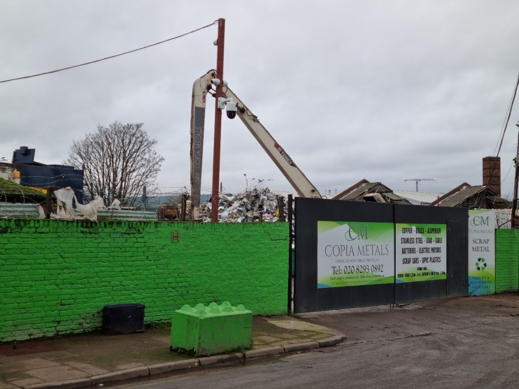 Beyond the tower surrounded by thick woodland should be the water tower which a sign said was more than 500 feet high! A monster of a water tower, a hundred feet higher than the spire of salisbury athedral which you can see from twenty miles away! But then I realised that they meant to say 500 feet above sea level. Even peering through the branches I couldn’t make out any height of water tower at all. Then on through the rump of Eltham common to the site of a big old hospital. The only thing they seem to have kept is the perimeter wall, which provides an excellent start for an extensive gated private development. See photos. More public space brought into captivity. Words like private replace displays of historical information. Silence. Cameras. Guard cars. Round that, a long walk since you can’t go through, at least half a mile down Broad Walk before you come to the main locked way in, and a sign that names the development as Brook Village, and then further to the first road that takes you round eventually onto Woolwich common, and so after a hospital, a cemetery and another park which we will hurry past now, you come, after crossing Woolwich Road, to the coastal strip: scrap, pallets, recycling, skips, old sheds, car repairs, caffs, church shacks, laid out on a grid of potholed roads and crumbling pavements, and we still seem to be some way from the river, although the Thames barrier is down there somewhere and I expected the whole neighbourhood to have been given heritage treatment. Instead, film locations to make any scandi-noir director envious. Surely there’s nowhere like this in Stockholm. A development in the heritage business could be to make visible and open up the low tide of commerce, down by the river, where it all began, where it all ends. Most districts like this are fenced off industrial estates. Soon I saw that I’d ended up there because I’d missed a last link in the Green Chain, a landscaped strip which takes the visitor on a salubrious route to the barrier from the Woolwich Road.