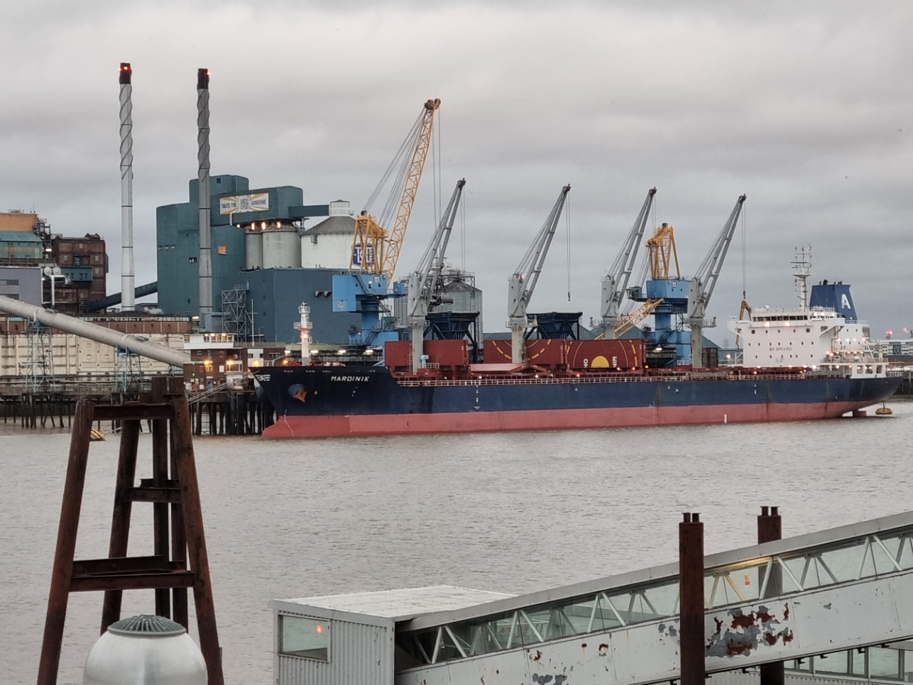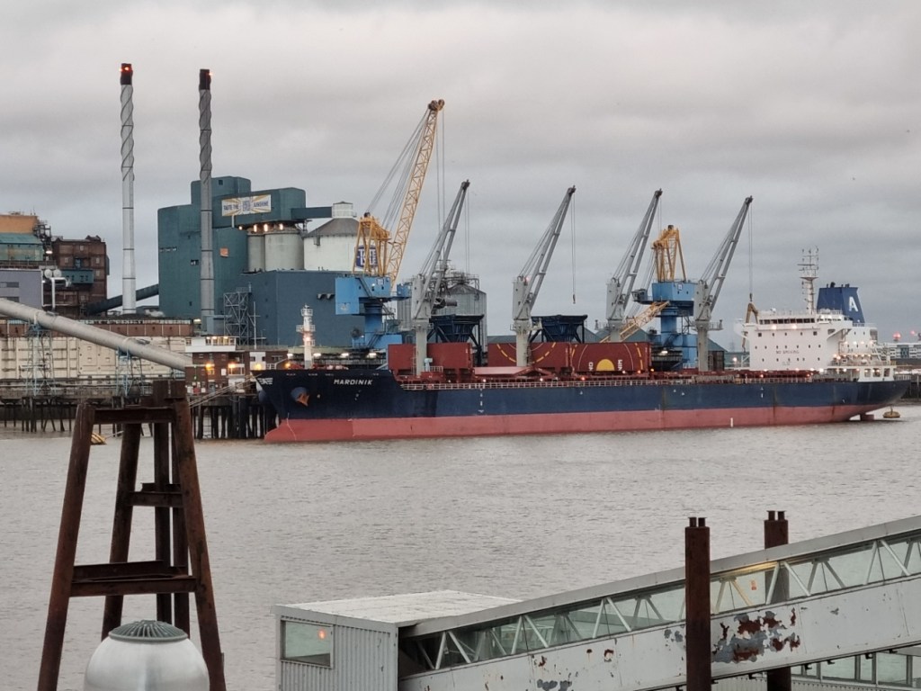 It was growing dark. Behind the barrier the towers of Canary Wharf are breeding. I’m sure there’s twice as may as when I last saw them. They crowd together in the distance like bristles on a pig’s back. A little way down river on the north bank a big ship was moored by Tate and Lyle’s Silvertown sugar refinery which is now owned by an American company but keeps its heritage name, and still imports and refines sugar cane. Naturally, these days all their sugar is fairly traded. Tate and Lyle now make artificial sweeteners.