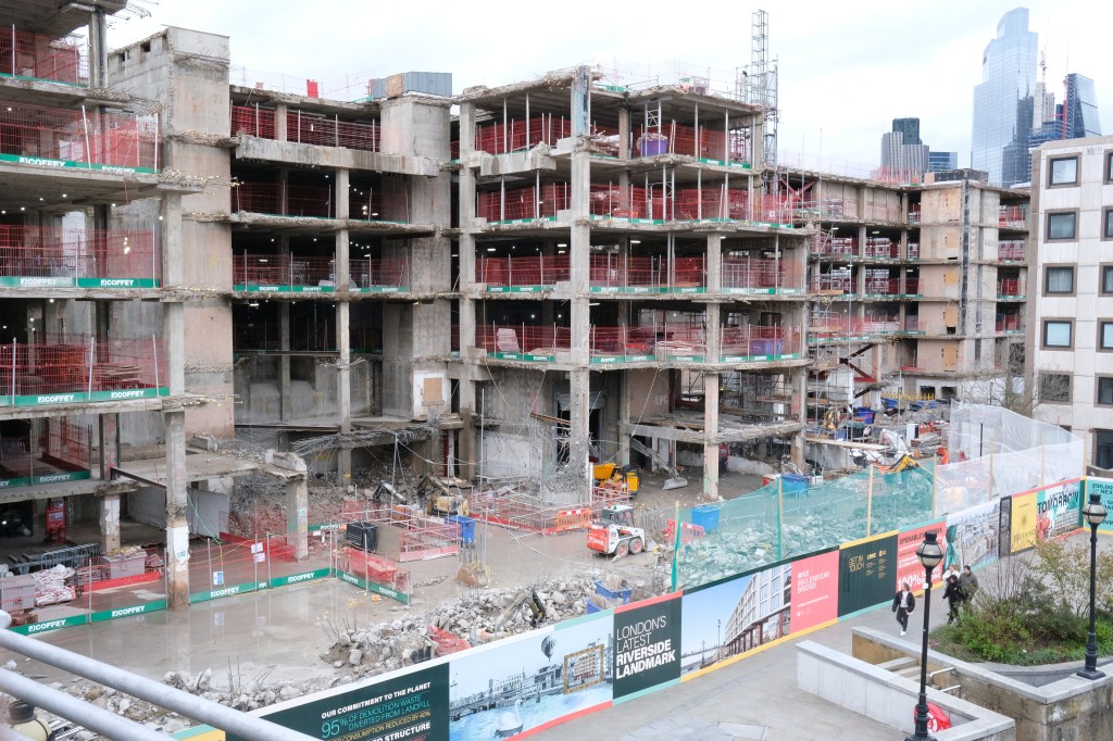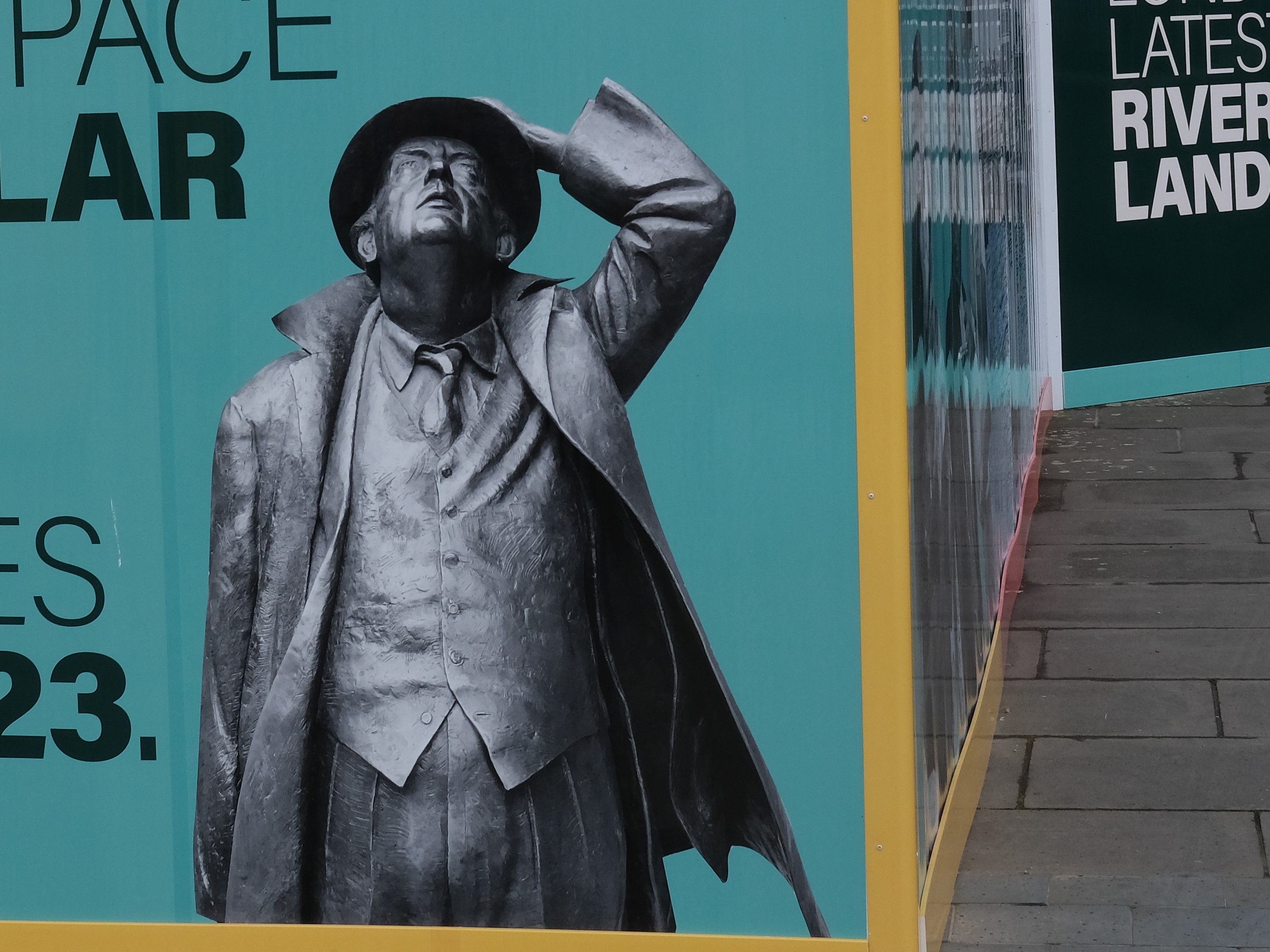 Yes, it’s London’s Latest Riverside Landmark! Though to be fair, Sir John is probably not staring at building site but wildly imagining the future, but at the moment, apart from the birds and roses (and there’s a swan and a big balloon and lots of dynamic young people dancing and running and smiling), it looks like this: