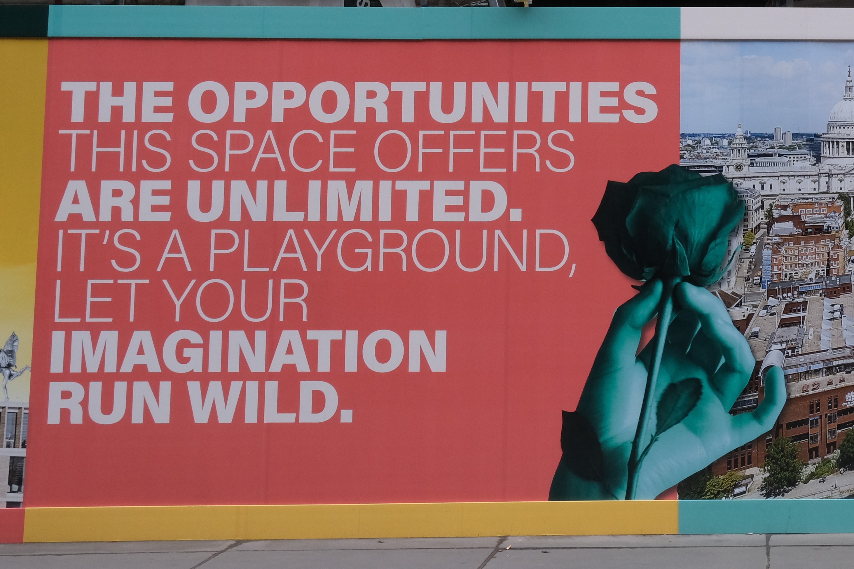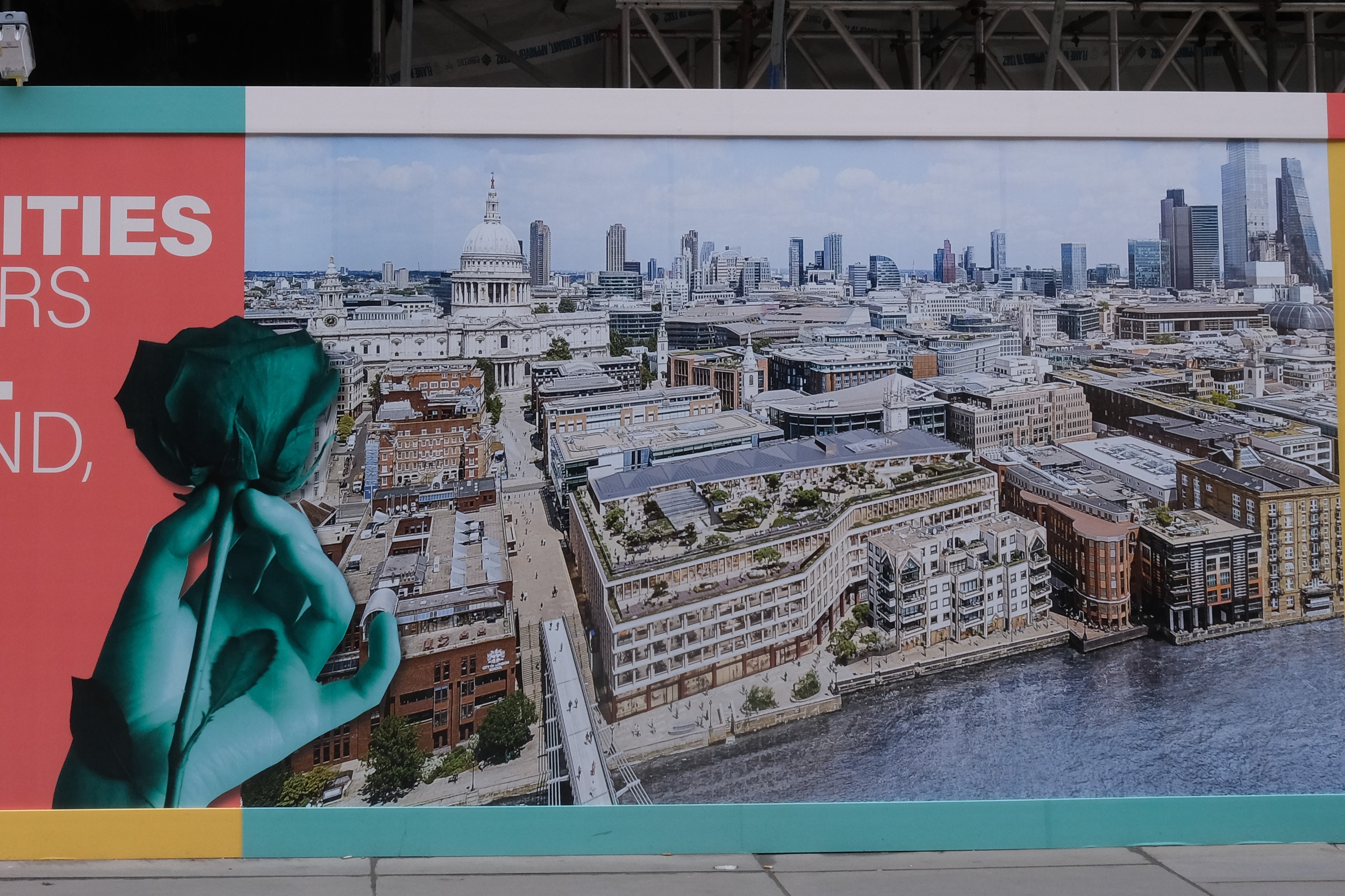 The building we are asked to imagine – although it looks as if the developers and architects have already done that – is in the foreground. To the left of it you can see the beginning of the millennium footbridge and in the background St Paul’s. Everything else, apart from several church needles in the dull haystack, is new, all the older buildings have been smothered.