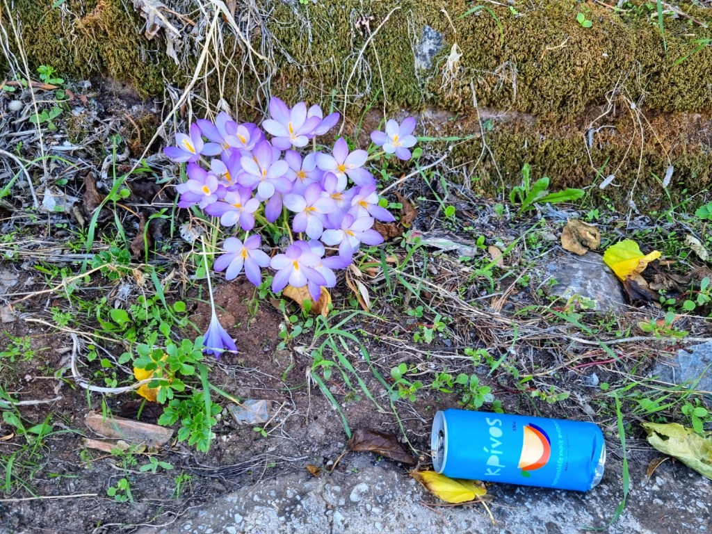 The can is labelled ‘crinos’, which means lily. I found a bin for it after taking the photo. The crocus is C. goulimyi, one of many autumn flowering crocuses in the Peloponnese.