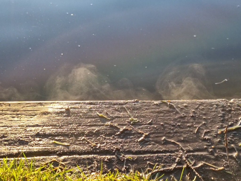 The east side of the pond is neatly edged with solid retaining timbers. These faced the low winter sun, and vapour rose from it, tiny clouds, you couldn’t call it steam, vapour like pale-grey smoke, twisting in the light breeze. All around the ground was saturated. I hadn’t walked on real mud, noisy, sticky, for ages. All the little paths were sodden and deep with mud; crowds of people strolled along the tarmac. The temperature couldn’t have been more than about 7 degrees, yet already the water had changed shape, and was rising up, like a first premonition of next summer’s drought. There was even a miniature, dim rainbow.