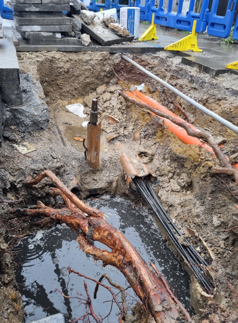 But look how careful they’ve tried to be with the tree roots! It’s a plane tree, not very big tree, maybe 5 or 6 metres high, but they love London, those roots just go boring through all kinds of crap. Would you worry about those cables though? They were threaded through an old pipe which has been smashed. A couple of blokes sat in a lorry in the rain looking at their phones. I tapped on the window and the guy weariy wound it down a few inches. I asked what they were doing. Leak. he said. Fixing a leak. Those roots must be a problem, I said. Yeah, he said. He didn’t want to chat. Nearer to my house, more entertainment: