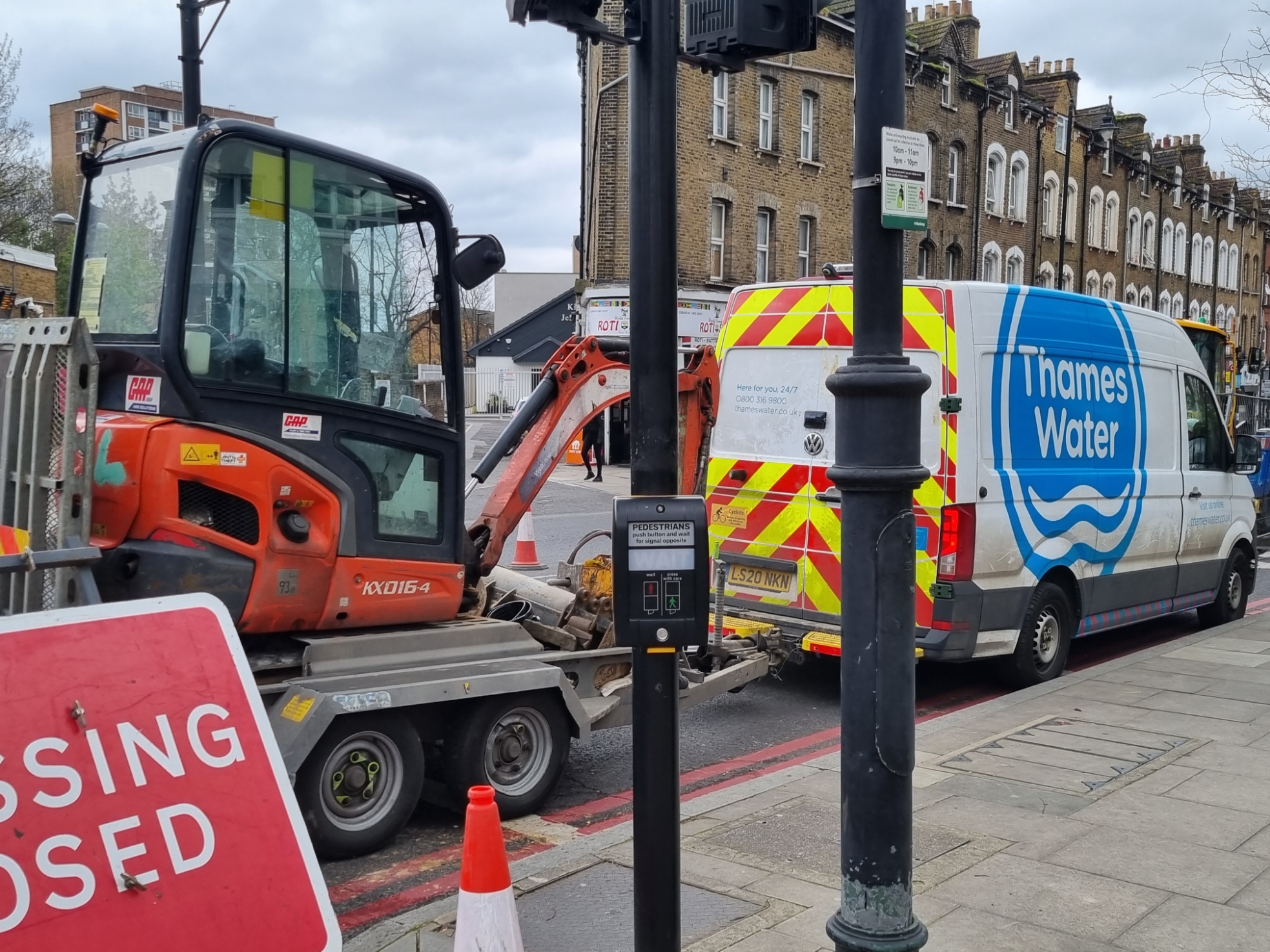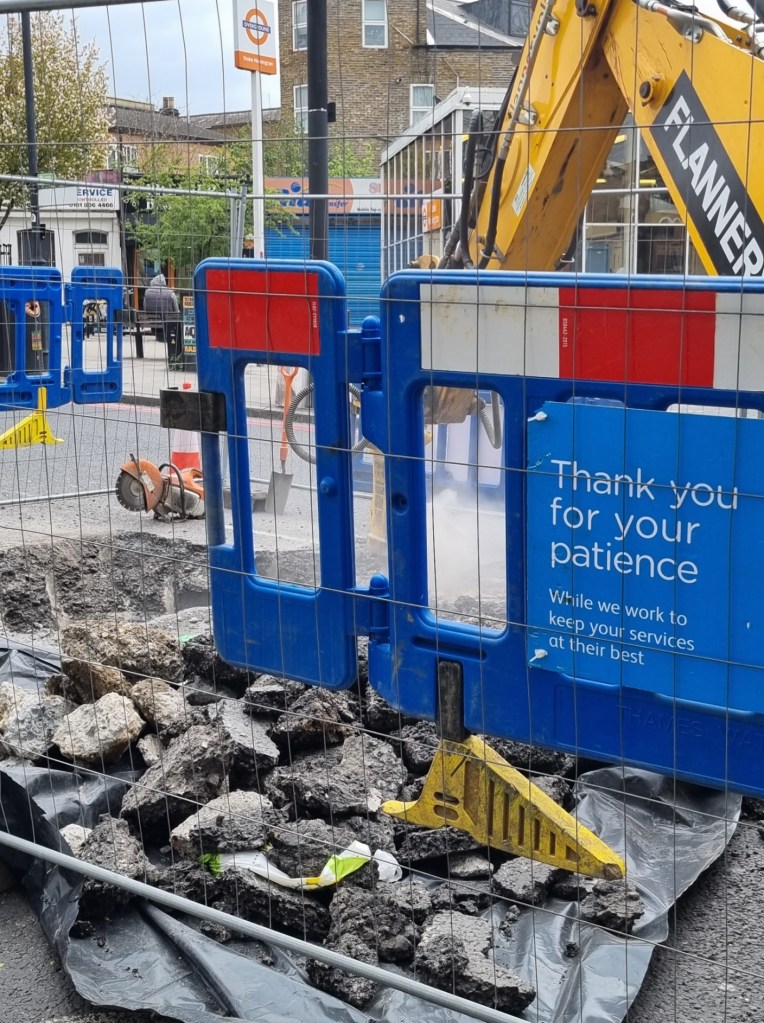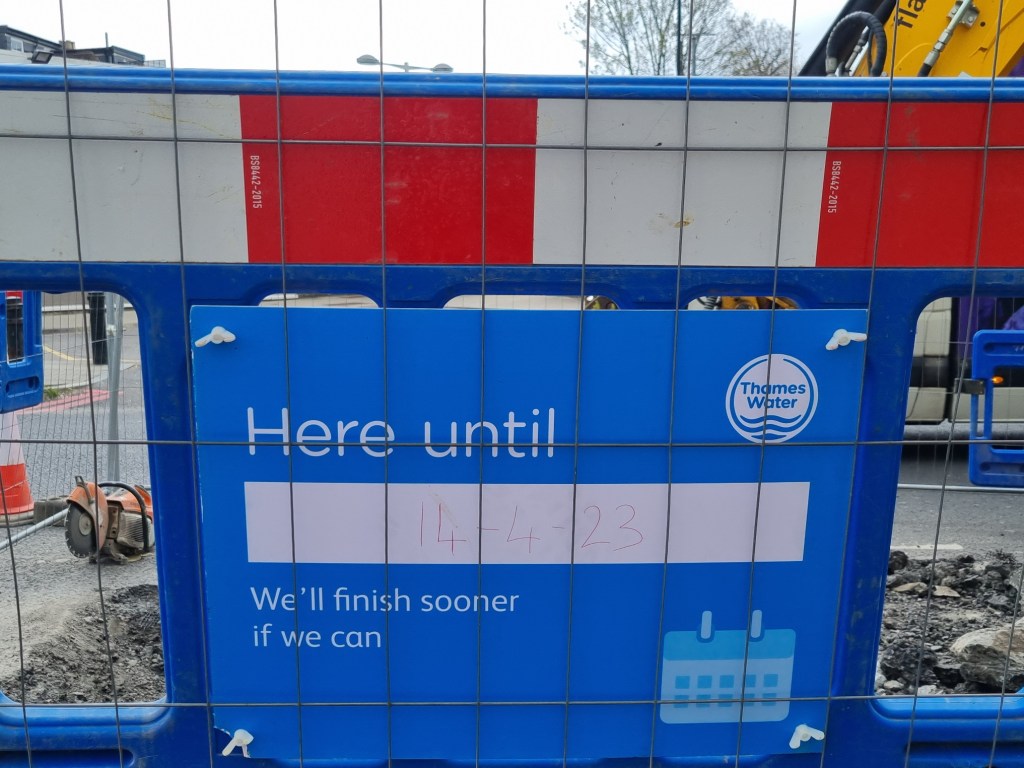 Thames Water are so reliable, and now they’re back. Just at the other end of the road, about 25 yards from that deep clever trench with the plane tree roots. (In Greece wherever there is water, overground or underground, plane trees grow, and maybe Thames Water have some connection with them too.) Their signs suggest that the quality of their service and of their water could be measured by how often they dig up the road. Having improved everything three weeks ago we were still not satisfied! We’re back to improve things even more. And by the way, thankyou for your patience. How do they know that we’re patient?