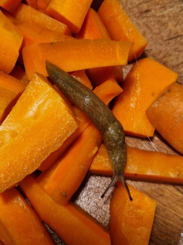 Where did that come from? It’s called a green cellar slug and the carrots were in the cellar but how come I didn’t see it when I chopped the up. They also like pet food apparently, are often found in compost heaps – handy because I then put it in the compost bucket – and don’t eat living plants. So that’s all right.