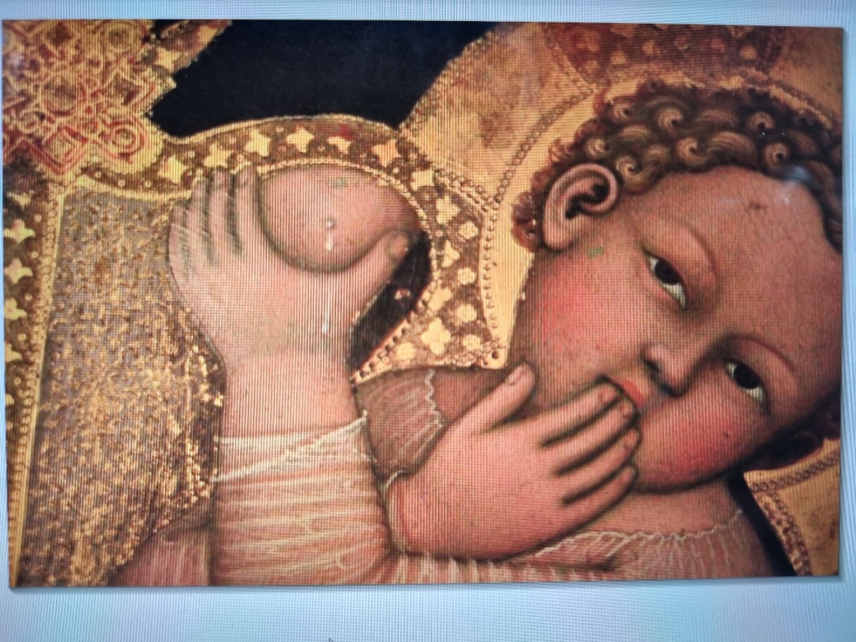I have had to hunt for this image from a photograph I took in 2012 in a gallery in Siena. Years ago I copied/uploaded it from my computer onto Photobox and used prints from their site make christmas cards. Sometimes though Photobox would take not just a copy but the whole thing, the original thing, and refuse to give them back. Sometimes with right clicking you could find a way to make it let go, other times no. Even if you could persuade them to give something back it was an inferior version. But what we have here is an even more inferior version: this is a photo I took with my smartphone of a version of the picture on the photobox website, which I then put onto my computer and from there onto the wordpress website which I use for my blog. The reason I’m telling you this is firstly to apologise for the poor quality of the image, which doesn’t matter much because it’s a powerful image, it’s a weak and powerful baby, but secondly to show that I am having to work at this, that there is work in remembering, in holding on to things, and also that forgetting and remembering go hand in hand.
