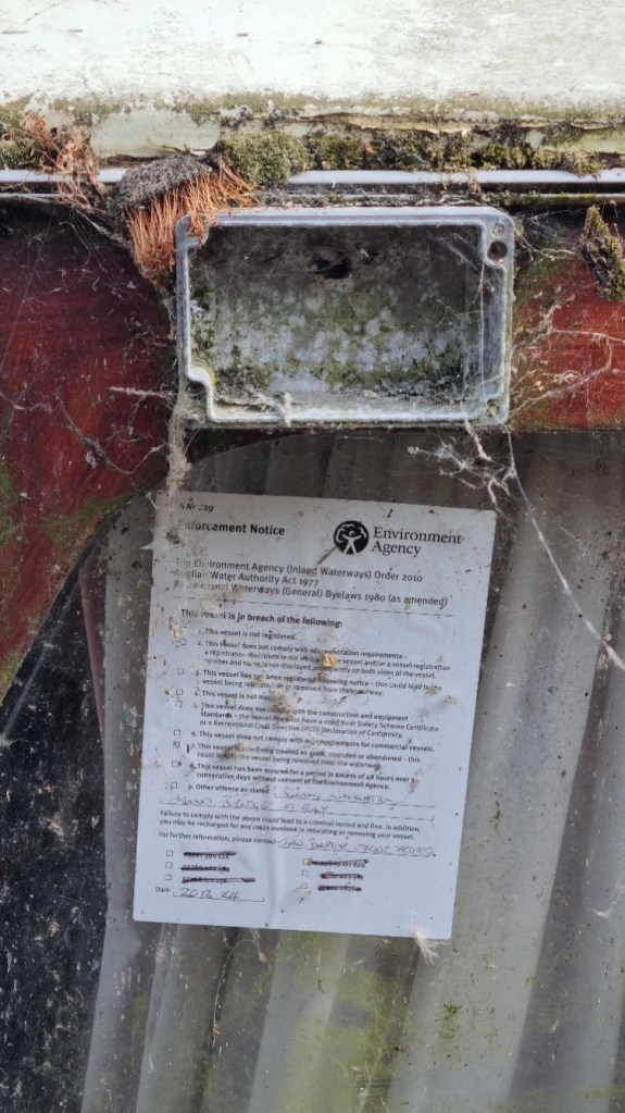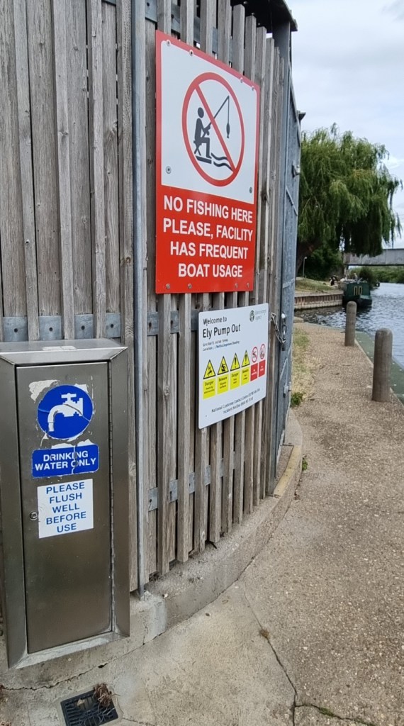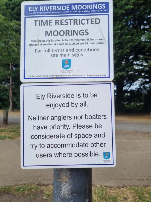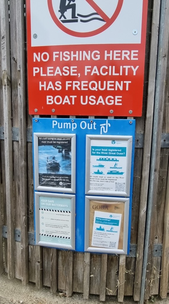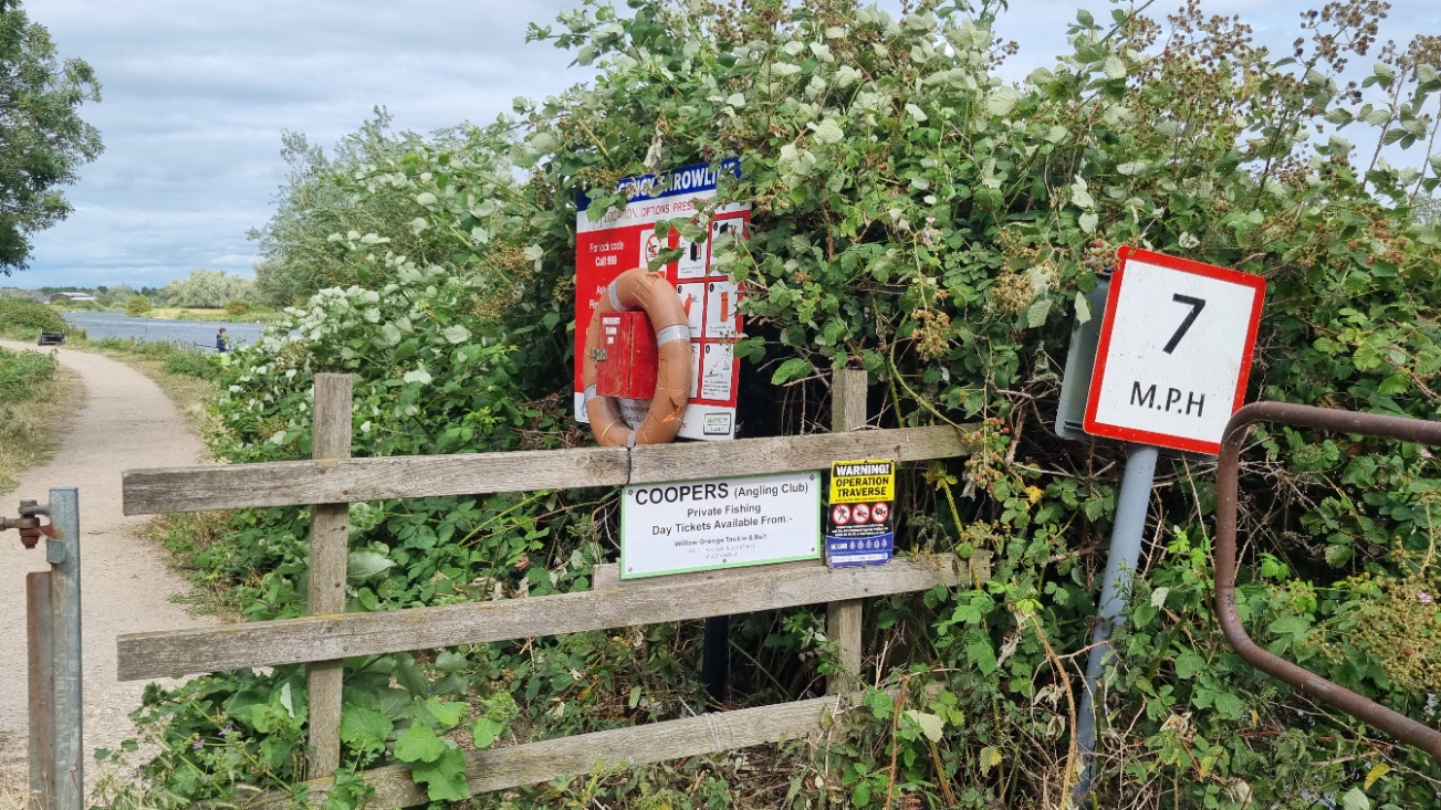 I began to notice all the signs and notices which multiply as you walk towards the low railway bridge over the river which marks the end of the park and the beginning of the meadows. Most of them seem to be directed at the river traffic and you don’t notice them unless you leave the path and walk right on the edge of the river bank. The boats need a lot of regulation and warnings. ‘Raw sewage’, for example, information which would be better directed towards the park, at people who might be tempted to go for a swim. Under the bridge, where the goods trains make a scary noise as they pass just over your head, is a dignified oval disc with its number. Immediately after the bridge, just before the kissing gate, is a big ring attached to a post to be thrown into the water if someone is in difficulty. On the post is a three word geo-locator, three unconnected words which I’ve forgotten, and a six part instruction for releasing and throwing the ring, but unfortunately two of the instructions are covered over by the ring itself. (But, you fool, when you take the ring down, all the instructions become clear.) Near that is the sign which says No Fishing, unless you’re in the club. And next to that a picturesquely derelict narrow boat which brambles and nettles lean out to embrace, with a faded notice dated January from the authorities which says essentially, move this boat or else. On the boat is a ruined bicycle which also failed to get away. On the left the most delicious fat blackberries in huge clusters were just beginning to ripen when they were cut back but left in situ to wither and rot. I wrote to the council to complain about that but strangely, I never received a reply. But maybe it was the railway authorities who were the bramble vandals.